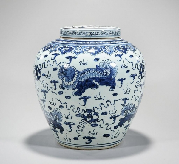 ANTIQUE CHINESE BLUE AND WHITE LIDDED JAR