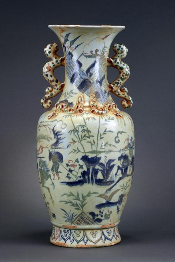 Painted with figural scene all around the body. Flanked by chilongs around the shoulder and two chilong handles on the neck. H: 24 in.(61cm)