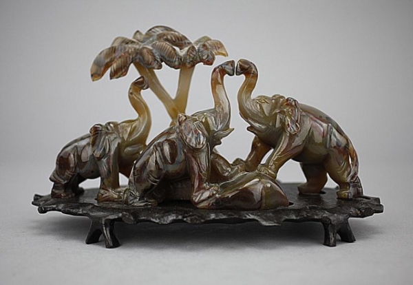 Of warm orange and caramel tones. Three elephants with their trunks up and with palm trees behind them. On a carved wooden stand. H: 5 1/4 in.