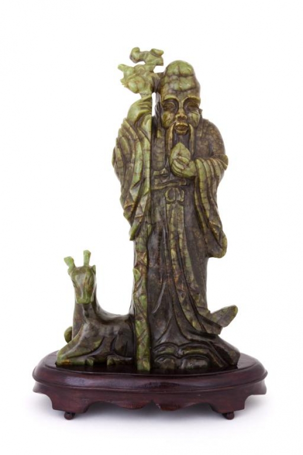 Standing in robe with a peach in one hand and a walking stick in the other hand. With a deer seated at his feet. H: 11 5/8 in.