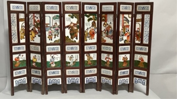 CHINESE EIGHT-PANELED WOOD AND PLAQUE FLOOR SCREEN