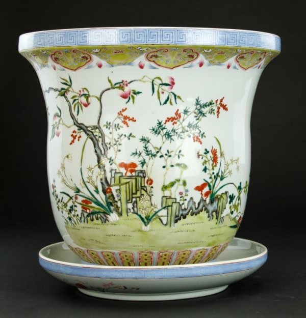 CHINESE FAMILLE ROSE JARDINIERE WITH TRAY