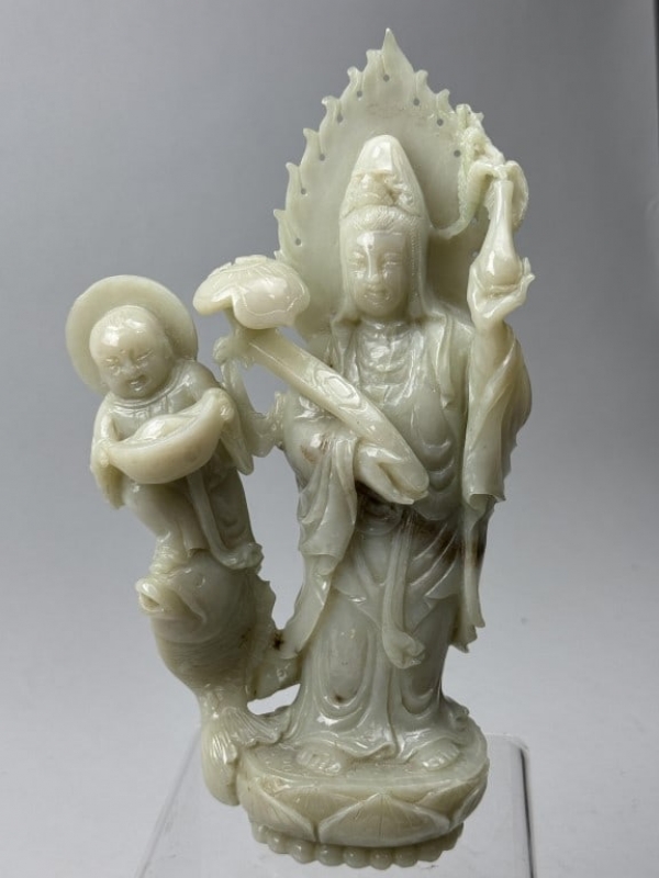 CHINESE JADE FIGURE OF GUANYIN & SUDHANA
