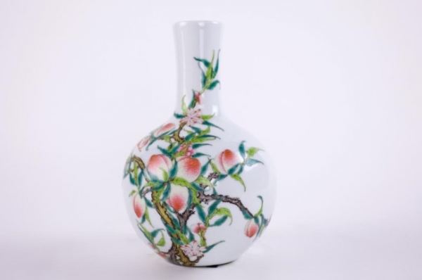 Of globular body painted with bat and peaches. Four character mark of Ju Ren Tang to the bottom. H: 8 in. Private Collection of California Collector