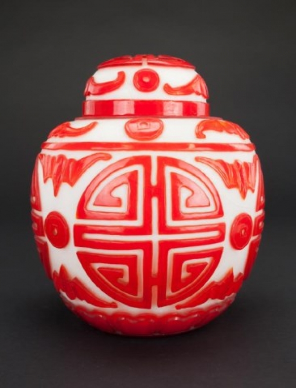 CHINESE RED OVERLAY PEKING GLASS LIDDED JAR
