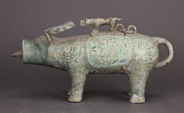 CHINESE STONE INLAID BRONZE WINE VESSEL OF AN OX