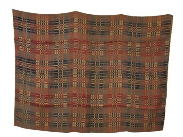 Of an overshot weave, woven on a linen foundation in indigo blue, white and cochineal red dyes, with a snowflake design. W: 57.5 in., L: 76.5 in.