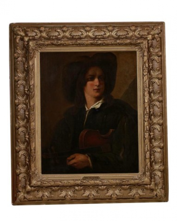 Man in a large hat, holding a violin under his arm; signature to read AL Scott on lower left. Oil on canvas in a giltwood frame. H: 31 1/4 in. (79.5cm) X W: 25 in. (63.5cm) (45 in. x 39 in. with frame)