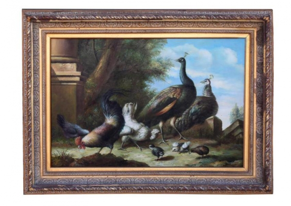FRAMED OIL ON PRINT OF PEACOCKS AND HENS