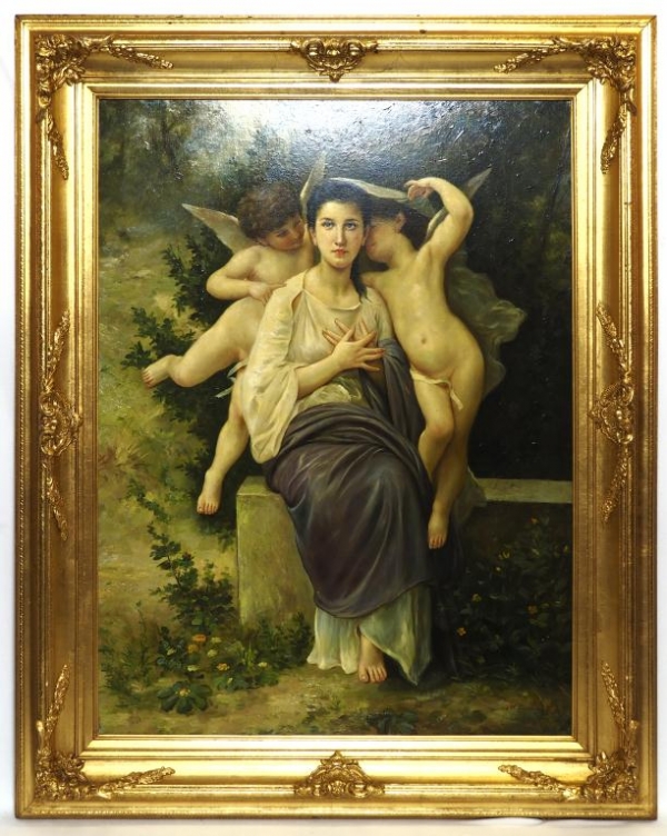FRAMED OIL PAINTING OF A WOMAN AND TWO CHERUBS