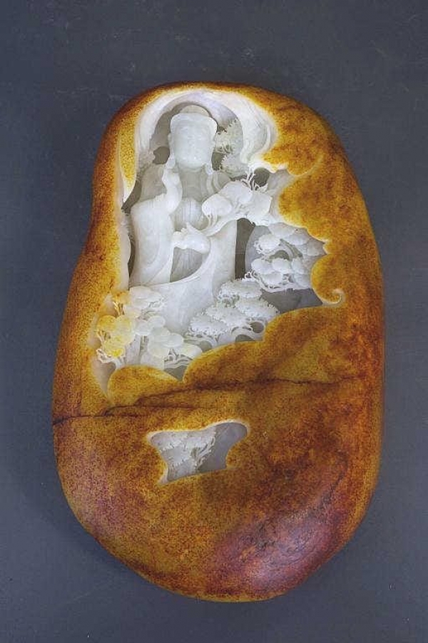 LARGE CARVED WHITE RIVER JADE BOULDER OF GUANYIN