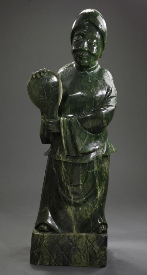 LARGE CHINESE SPINACH GREEN JADE FIGURE OF LUOHAN