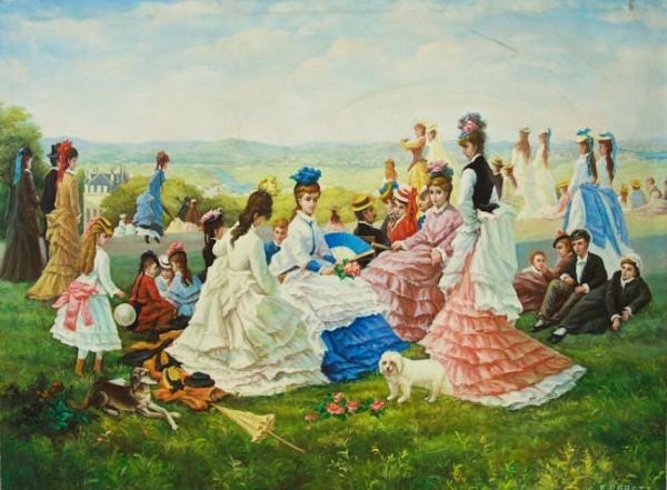 LARGE OIL ON CANVAS PAINTING OF A PARK GATHERING