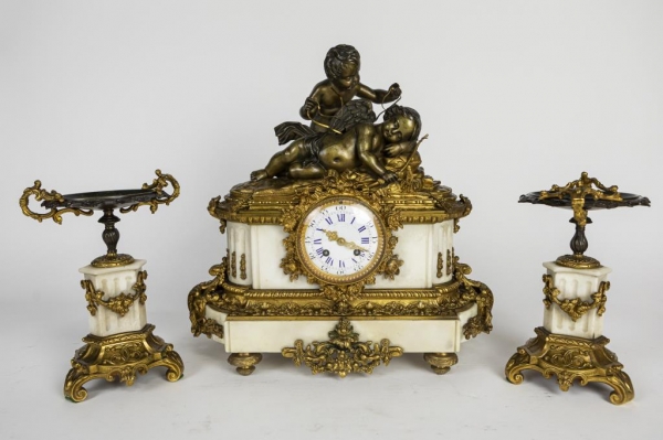 LE ROY ET FILS WHITE MARBLE & GILT BRONZE CLOCKSET
