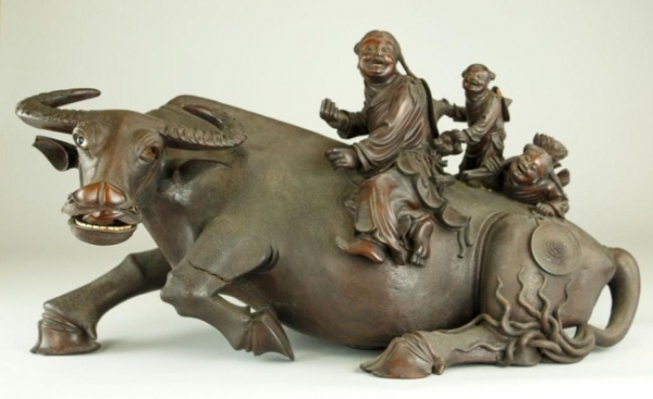 Hand carved with three figures riding upon its back. Inlaid eyes. L: 30 in., H: 15 1/2 in.