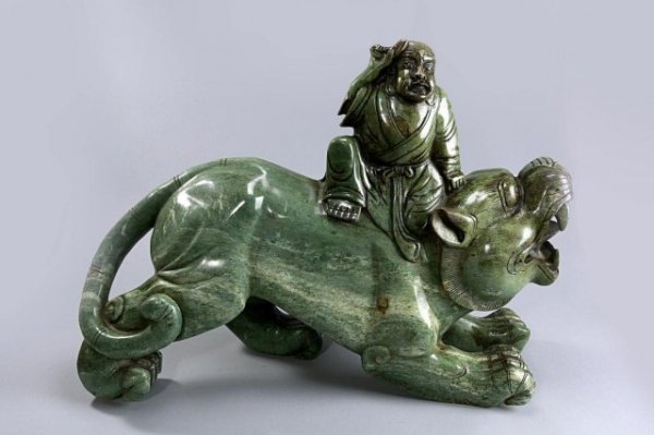 MASSIVE JADE FIGURAL GROUP OF LUOHAN ON A PIXIU