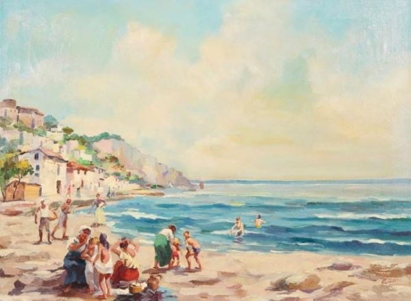 OIL ON CANVAS PAINTING OF A BEACH SCENE BY MANELLI