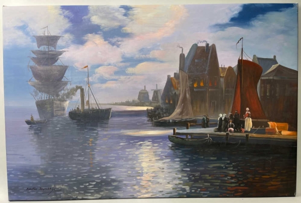 OIL ON CANVAS PAINTING OF A CITY PORT SCENE