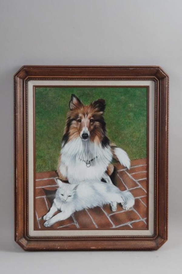 OIL ON CANVAS PAINTING OF A DOG AND A WHITE CAT