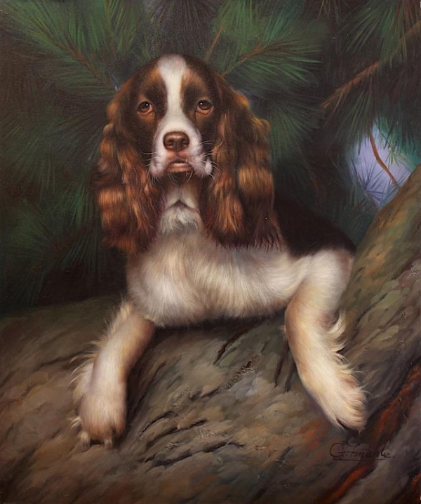 An English Cocker Spaniel dog sits on a tree branch. 20 X 24 in.