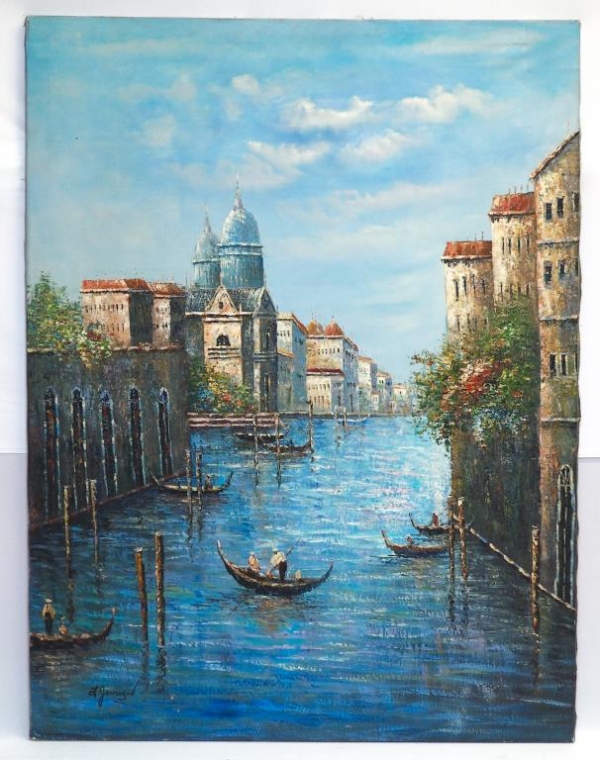OIL ON CANVAS PAINTING OF CANAL CITY WITH GONDOLAS