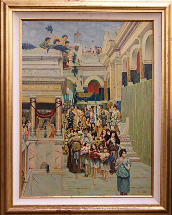 OIL ON PRINT CANVAS OF A CELEBRATION SCENE