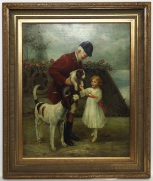 OIL PAINTING OF MAN & CHILD WITH DOGS IN FRAME