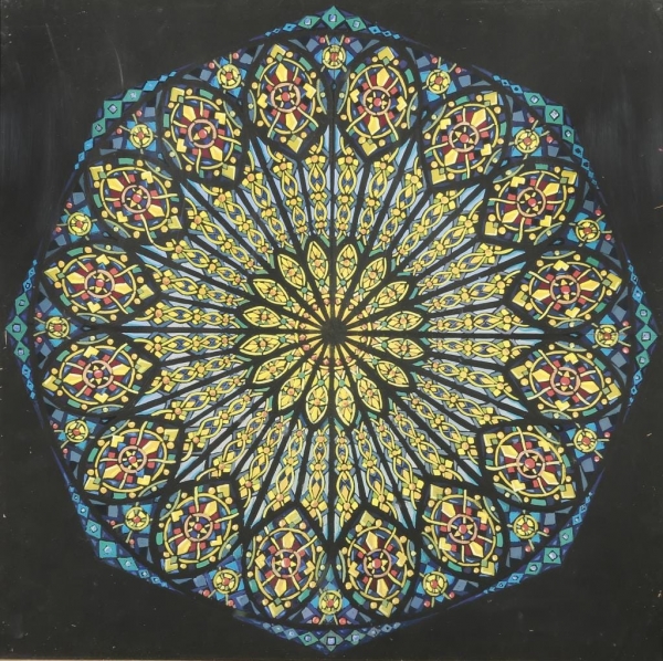 OIL PAINTING ON BOARD OF A STAINED GLASS WINDOW