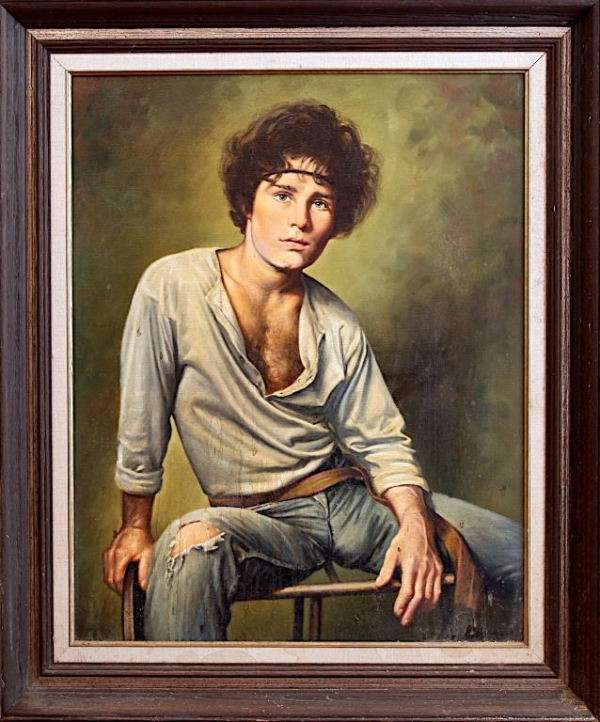 A man is sitting on a chair, wearing casual T-shirt and cave jeans. Signature read as “A.DEFNAMGE”,Signed on the bottom right corner. L: 23 1/2 in; H: 29 1/2 in.