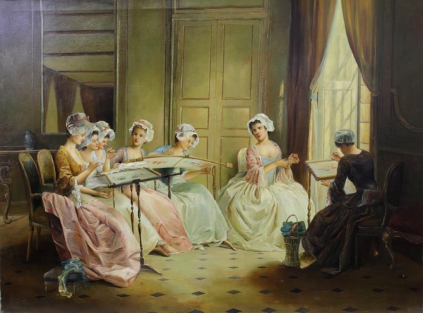OIL PAINTING ON CANVAS OF WOMEN MAKING CRAFTS