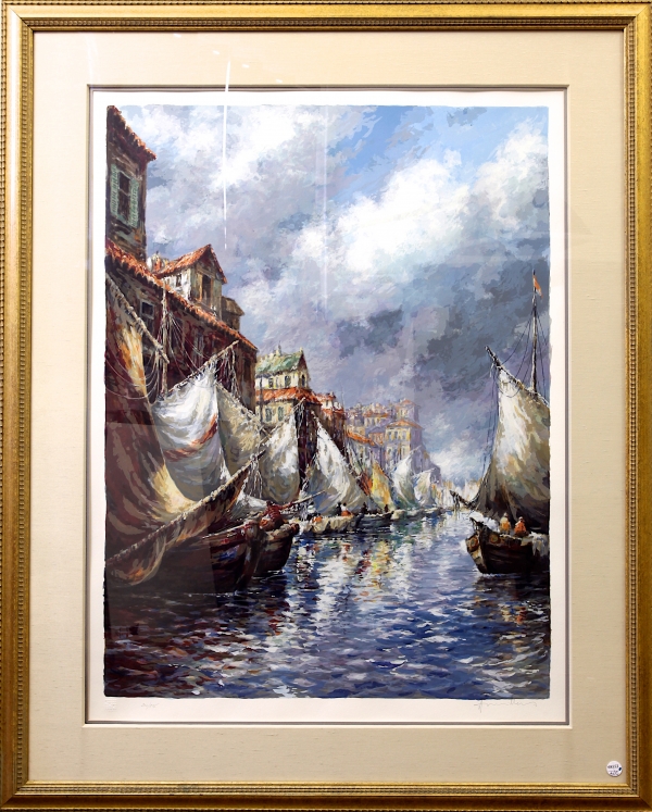 Limited edition, hand signed and numbered 200/ 275 by Americo Makk. With certificate of authenticity. Depicts a vibrant and colorful waterfront scene, rich in old world charm. The eye is drawn into the piece, down along the waterway past the docked boats. The image was printed in sixty eight (68) colors, with all imaging materials having been created by the artist’s own hand. H: 42 1/2 in. L: 32 in.