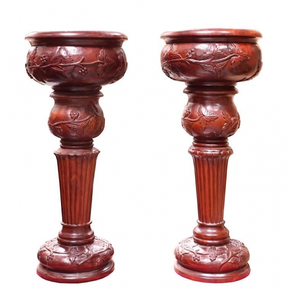 PAIR OF HAND CAVED WOODEN JARDINIERES AND STANDS