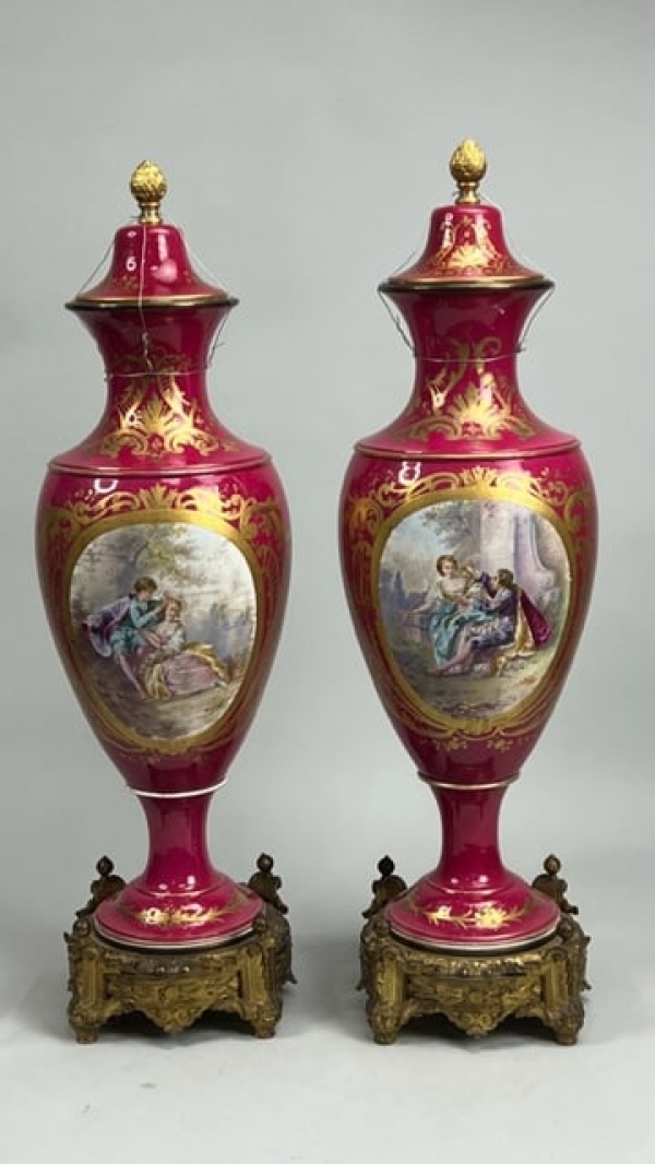 PAIR OF LARGE FRENCH SEVRES PORCELAIN LIDDED VASES