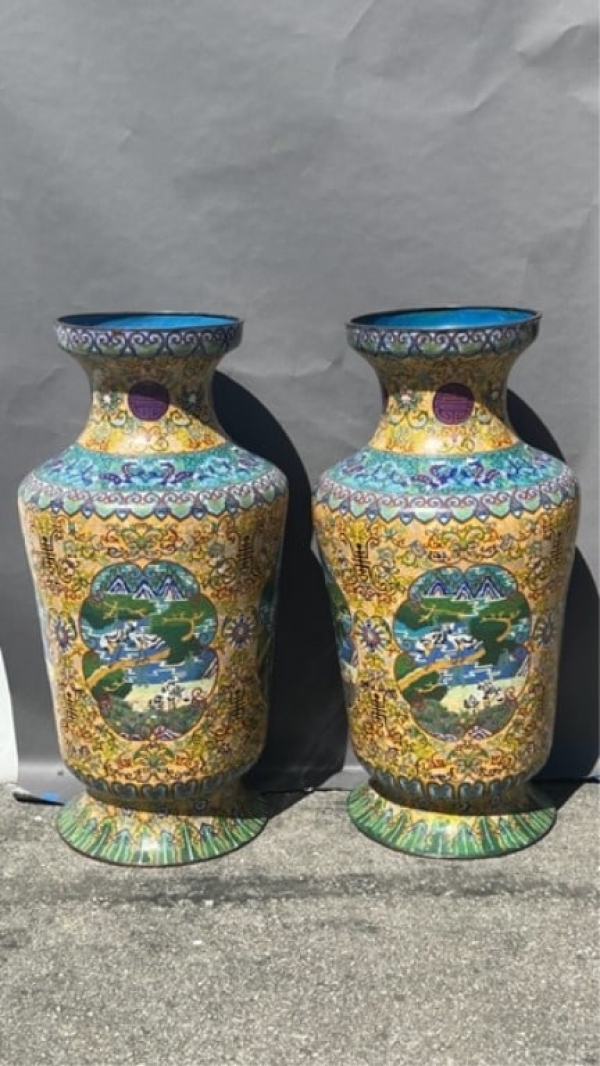 PAIR OF LARGE YELLOW CLOISONNE VASES