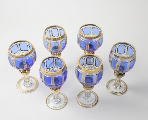 Each glass raised on a tall stem, beautifully decorated with gilt details.
