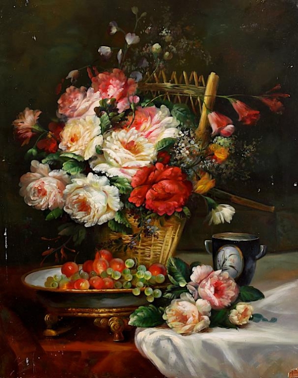 A scene of a basket flowers with a plate of fruits and a cup. 16 in X 20 in.